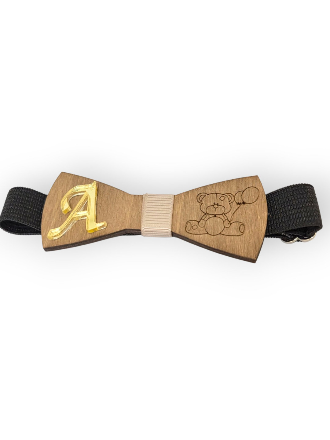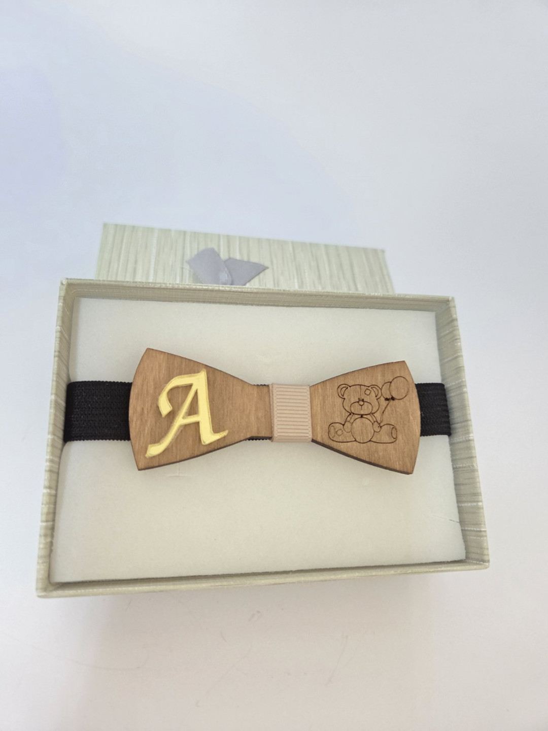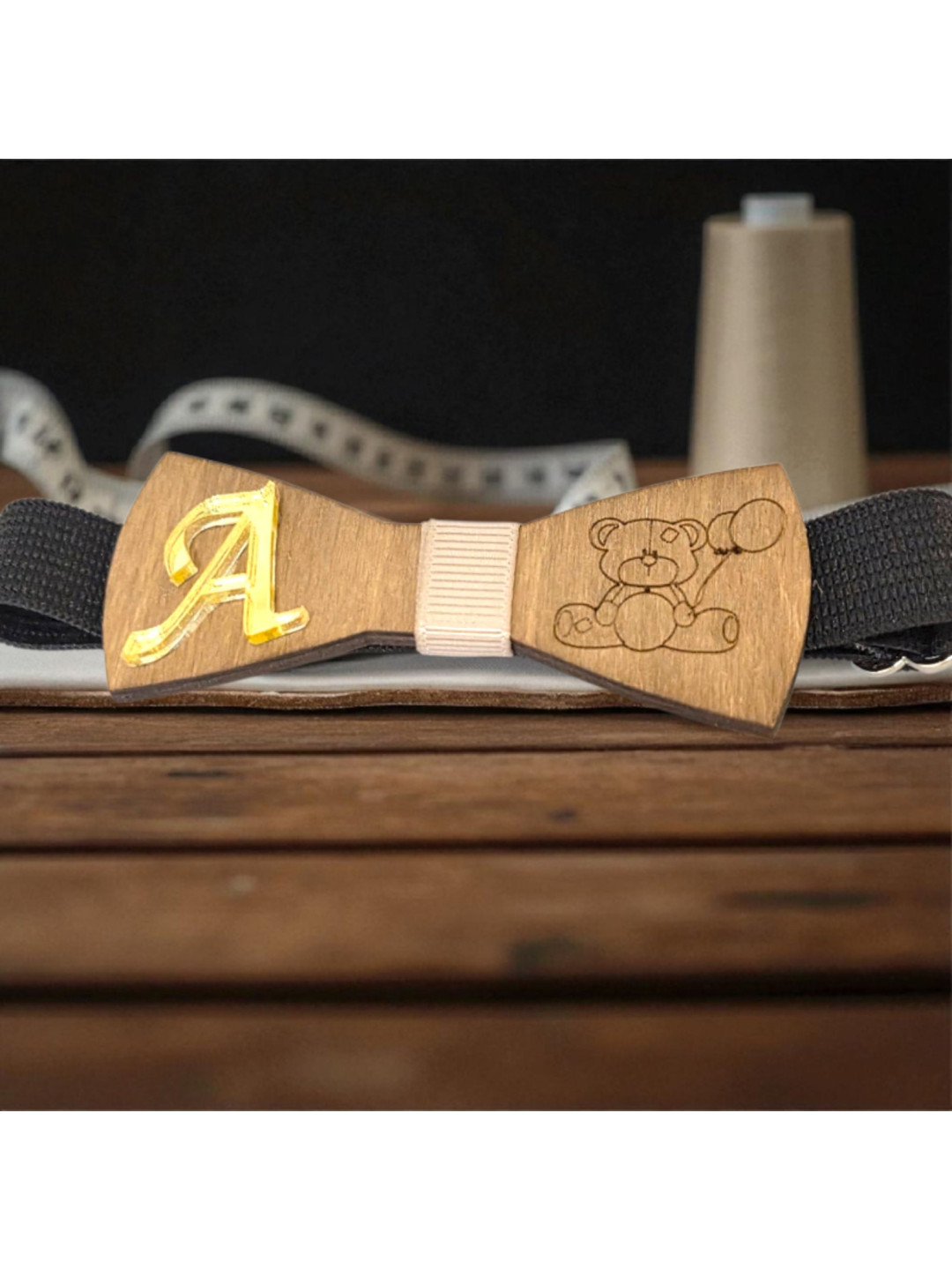 Ξύλινο παπιγιόν με αρκουδάκι και μονόγραμμα PAPILLON13