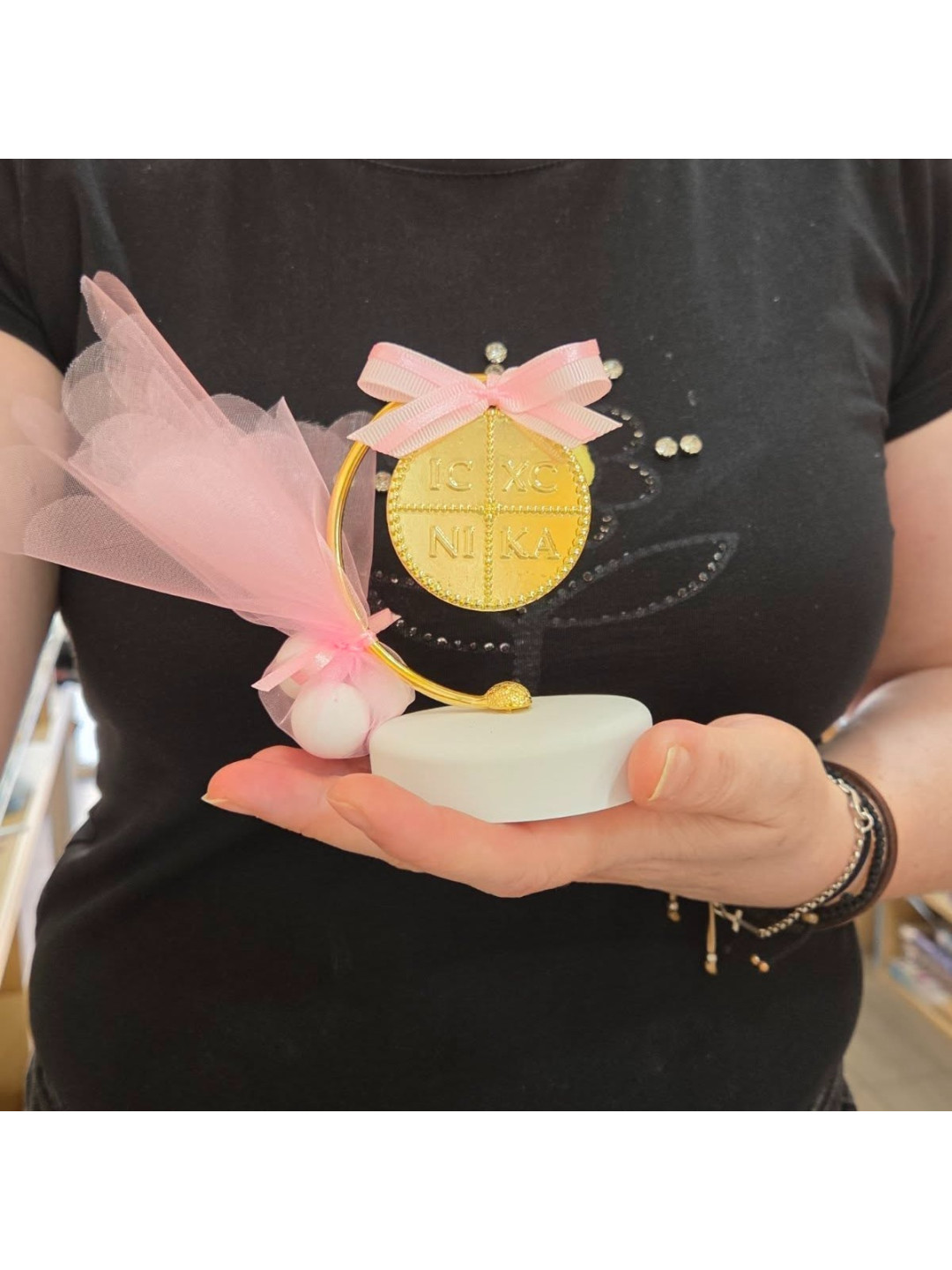 Χειροποίητη μπομπονιέρα, επιτραπέζιο διακοσμητικό, φτιαγμένη με μεταλλικό επιχρυσωμένο στεφάνι επάνω σε βάση λευκό  βότσαλο, με