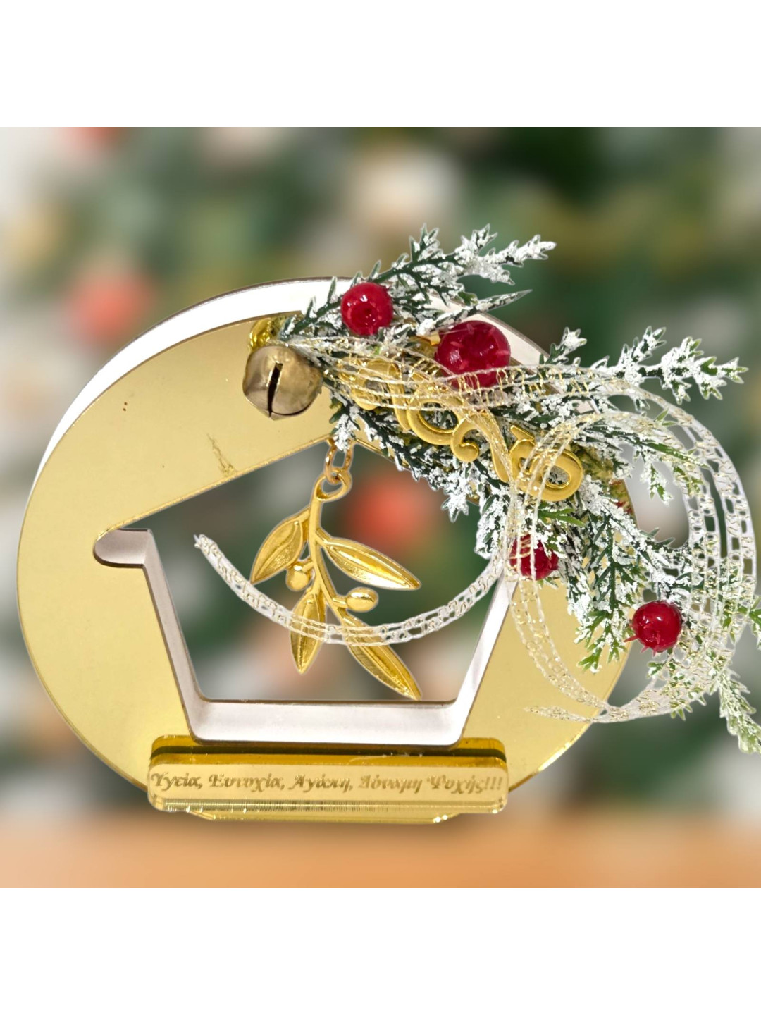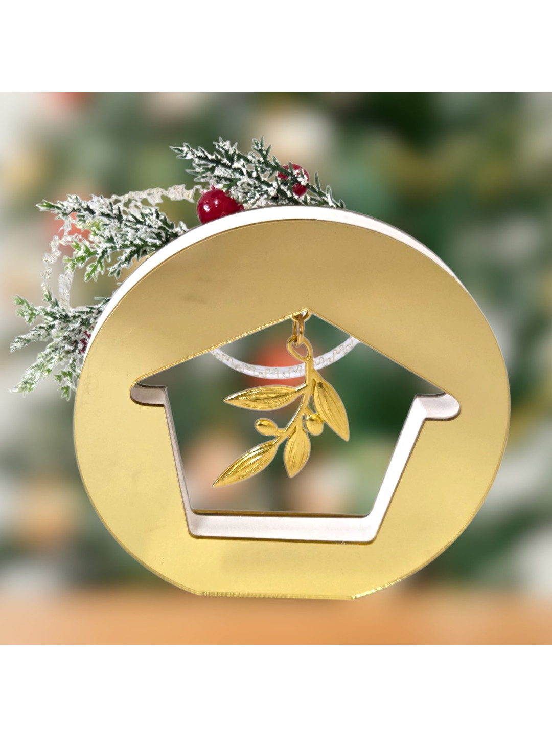 Κομψό Μικρό χειροποίητο επιτραπέζιο γούρι φτιαγμένο με ακρυλική βάση διατρητο σπίτι και plexiglass χρυσο καθρέφτη γύρω γύρω με με επιχρυσωμένο στοιχείο κλαδί ελιάς και χριστουγεννιάτικη διακόσμηση. Στολισμένο με κόκκινες μπιλίτσες και φιόγκο, μεταφέρει τις ευχές για καλή χρονιά με αγάπη και χαρά.