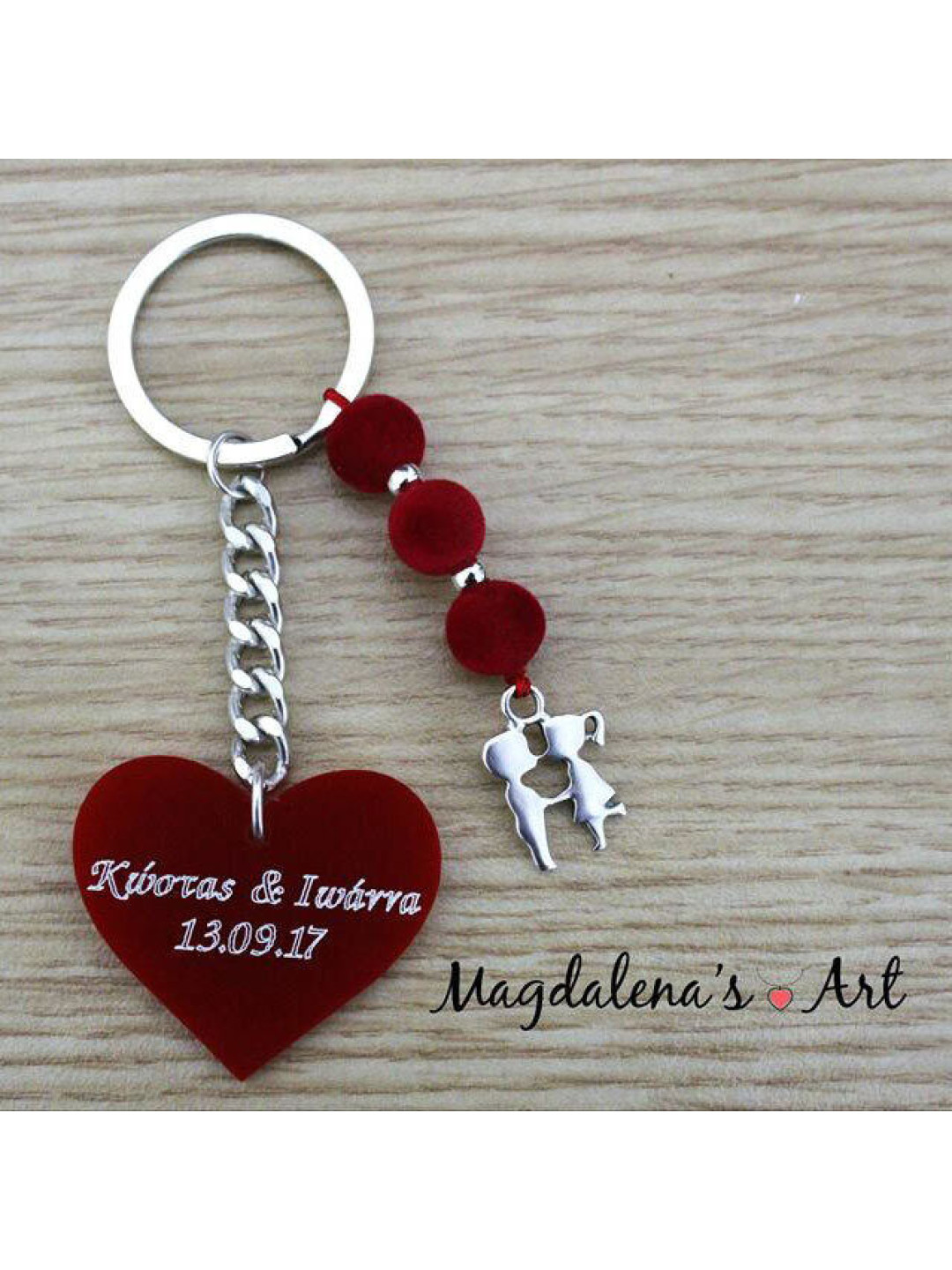 | Στοιχεία: | Μπρελόκ φτιαγμένο με plexiglass, με χάραξη της επιλογής σας διακοσμημένο με βελούδινες περαστές κόκκινες χάντρες και ασημί κρεμαστό στοιχείο ζευγαράκι,τιμή 18 ευρώ το ένα μπρελόκ |