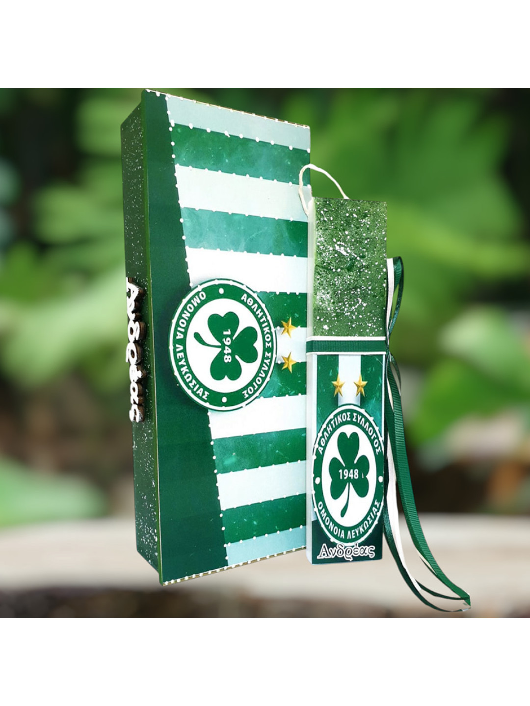 Περιγραφή: ΣΕΤ Αθλητικός σύλλογος ομόνοιας Λευκωσίας λαμπαδάκι και χειροποίητο ξύλινο κουτί βιβλίο, το οποίο μπορεί να χρησιμοποιηθεί για διακόσμηση, για να μπούνε χρηστικά αντικείμενα κοκ.