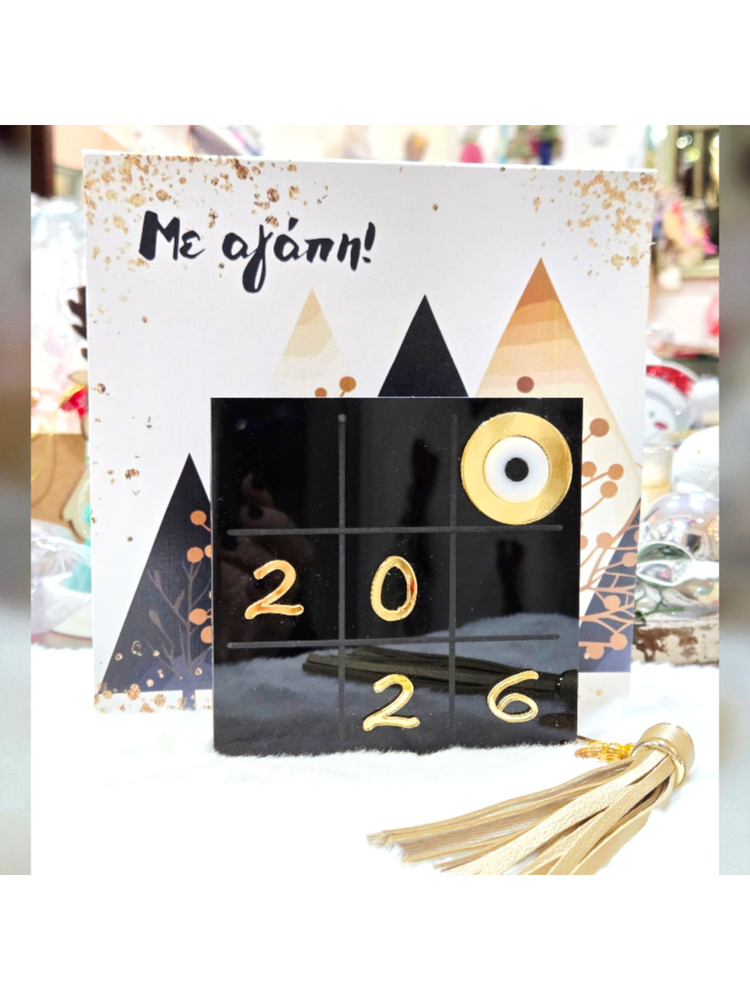 Ένα εντυπωσιακό, τετράγωνο plexiglass επιτραπέζιο γούρι με τον αριθμό 2026 σε χρυσό καθρέφτη, που τραβάει αμέσως το φως και δίνει μια λαμπερή, γιορτινή διάθεση στον χώρο. Το μαύρο Plexiglas κάνει την αντίθεση ακόμα πιο δυνατή, ενώ το ματάκι στη γωνία συμπληρώνει το κομμάτι με έναν διακριτικό συμβολισμό προστασίας. Είναι κομψό, μοντέρνο και ξεχωρίζει με την πρώτη ματιά.
